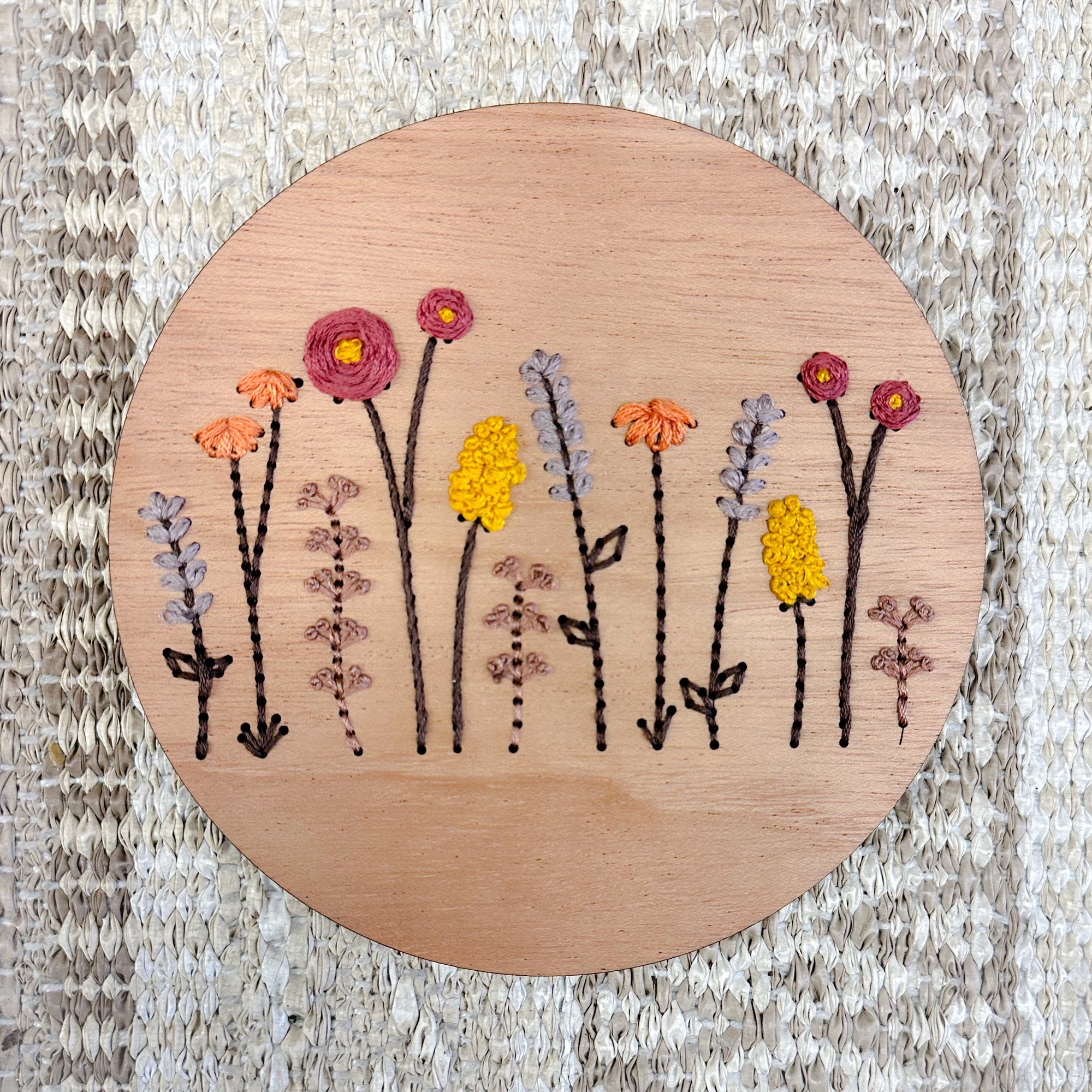 Excluding tools (like scissors), each kit comes with everything you need to complete the project. This means you will receive: The wood blank, full skeins of DMC thread, needles, and felt for backing.